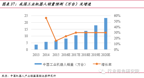 工業(yè)機(jī)器人的大規(guī)模使用,不僅可以助推企業(yè)轉(zhuǎn)型,而且也給智能制造業(yè)帶來(lái)巨大的市場(chǎng)需求。從全球來(lái)看,2014年工業(yè)機(jī)器人年銷(xiāo)售額約59億美元,銷(xiāo)量為22.5萬(wàn)臺(tái)左右,比2013年增長(zhǎng) 27%。我國(guó)是世界上增長(zhǎng)最快的市場(chǎng),前瞻產(chǎn)業(yè)研究院提供的數(shù)據(jù)顯示, 2015年工業(yè)機(jī)器人銷(xiāo)量高達(dá)66000臺(tái),在2013 年的基礎(chǔ)上增長(zhǎng)了 80%,繼續(xù)保持高速發(fā)展態(tài)勢(shì)。