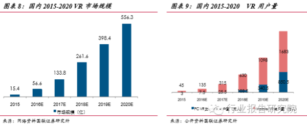 下一代計(jì)算平臺(tái),顛覆眾多傳統(tǒng)領(lǐng)域。預(yù)計(jì)2016年國(guó)內(nèi)VR市場(chǎng)增長(zhǎng)了近四倍, 之后的增速雖然有所減緩,但是市場(chǎng)的規(guī)模成倍增加。到2020年,市場(chǎng)規(guī)??梢赃_(dá)到556億元,用戶(hù)量達(dá)到2500萬(wàn),其中PC端用戶(hù)量將會(huì)突破850萬(wàn)人,移動(dòng)端將會(huì)達(dá)到1683萬(wàn)人,出貨量達(dá)到820萬(wàn)臺(tái),其中PCVR一體機(jī)的出貨量170 萬(wàn)臺(tái),移動(dòng)VR出貨量750萬(wàn)臺(tái),移動(dòng)端的VR市場(chǎng)爆發(fā)的更加的迅速,市場(chǎng)潛力更大。