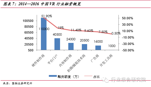 蓄勢(shì)待發(fā),爆發(fā)潛能驚人。VR 硬件包括輸出設(shè)備如 PC 端顯示頭戴,移動(dòng)端顯 示頭戴,以及輸入設(shè)備如手柄,跑步機(jī),動(dòng)作捕捉識(shí)別設(shè)備,全景相機(jī)等。國(guó)內(nèi)目前融資最大的一塊就是硬件制作商,占比達(dá)到 51.9%,這也說(shuō)明了國(guó)內(nèi)的 VR市場(chǎng)還處在初期,國(guó)外的VR已經(jīng)形成了產(chǎn)業(yè)化,國(guó)內(nèi)的市場(chǎng)雖然處于初期但是成長(zhǎng)的潛力確實(shí)非常大的。