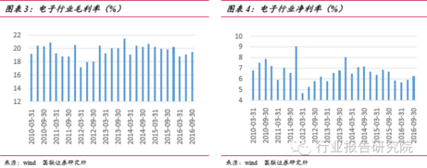 本文將電子行業(yè)按照申萬(wàn)的行業(yè)分類(lèi),分為半導(dǎo)體、元件、光學(xué)光電子、電子制 造和其他電子五個(gè)子版塊。16 年前三季度,電子行業(yè)實(shí)現(xiàn)營(yíng)收合計(jì)4067.24 億元,同比增長(zhǎng) 25.71%;實(shí)現(xiàn)歸母凈利潤(rùn) 254.78 億元,同比增長(zhǎng) 22.13%。產(chǎn)業(yè)營(yíng)收規(guī)模再次創(chuàng)出行業(yè)同期新高,產(chǎn)值和利潤(rùn)規(guī)模均出現(xiàn)環(huán)比上升的勢(shì)頭,整體向好趨勢(shì)顯著。